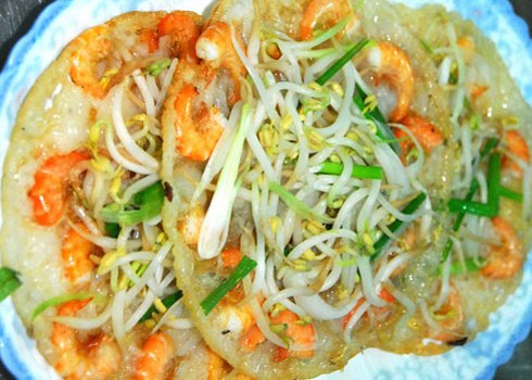 Khi ăn bạn sẽ cảm nhận vị ngọt của tôm, lẫn trong thứ bột gạo thơm thơm, ăn kèm rau sống rất hấp dẫn. Món ăn này nhất định phải có nước chấm được pha chế đúng vị. Bạn có thể ăn ở phố Diên Hồng, với giá khoảng 25.000 đồng/ chiếc.
