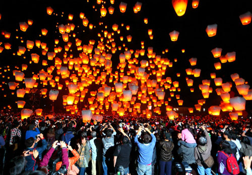 Nếu Hong Kong đón cái Tết bằng những lễ hội vui nhộn thì không khí Tết ở Đài Loan mang lại cảm giác yên bình và êm ấm. Bạn có thể cảm nhận không khí Tết ở Đài Loàn qua các phiên chợ từ trước tết, các loại bánh mức được bày bán đầy màu sắc tượng trưng cho sự may mắn trong năm mới. Vào dịp này ngoài các danh lam thắng cảnh tuyệt đẹp chờ đợi bạn khám phá, bạn còn có thể đi đến các đền, chùa cầu may đầu năm hoặc tham gia lễ hội thả hoa đăng, rước đèn cầu may đầu năm.