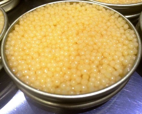 Đây là trứng của loài cá tầm bạch tạng Almas quý hiếm. Trứng căng bóng như ngọc trai và kết cấu mềm xốp. Những con cá được lấy trứng phải có tuổi thọ từ 60 đến 100 năm, nặng khoảng hơn 900 kg, tương đương với trọng lượng của một chiếc Volkswagen Beetle. Địa chỉ thưởng thức là cửa hàng Caviar House & Prunier, London, Anh.