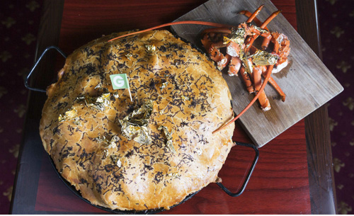 Bánh pie bò nướng sử dụng bò Wagyu, nấm matsutake, nấm cục đen, vàng lá và rượu vang đỏ Chateau Mouton Rothschild giá hàng nghìn USD. Đầu bếp ở Fence Gate Inn, Lancashire (Anh), nơi chế biến ra món bánh pie đắt đỏ khẳng định chiếc bánh hoàn toàn xứng đáng với số tiền thực khách bỏ ra. Bánh có giá 15.900 USD (353 triệu đồng).