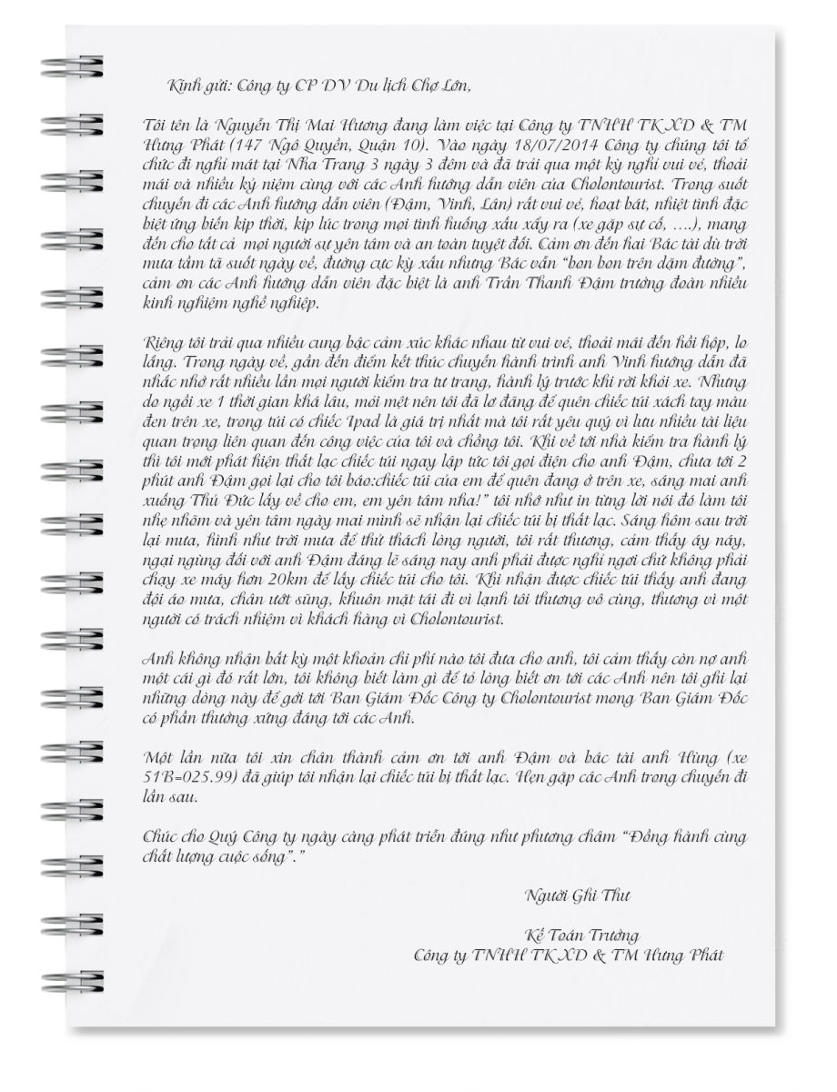 Cholontourist chân thành cảm ơn Cô Nguyễn Thị Mai Hương - Kế toán trưởng Công ty TNHH TK XD & TM Hưng Phát về bức “Thư cảm ơn” sau chuyến đi tour du lịch Nha Trang… đã nêu được tinh thần trách nhiệm của hướng dẫn viên du lịch của Cholontourist là Anh Trần Thanh Đậm và đồng nghiệp đã có nhiều nổ lực, kịp thời tìm kiếm và hoàn trả lại tài sản cá nhân của du khách khi bị thất lạc khi đi du lịch. Với giọng văn thân thiện và cảm động của “Thư cảm ơn” đã là một nguồn động viên cổ vũ cho Lãnh đạo và nhân viên Trung tâm Lữ hành Cholontourist tự nhủ rằng : “Luôn phấn đấu ngày càng hoàn thiện công tác chuyên môn nghiệp vụ, rèn luyện đạo đức nghề nghiệp” phục vụ tốt hơn nữa đối với du khách gần xa.