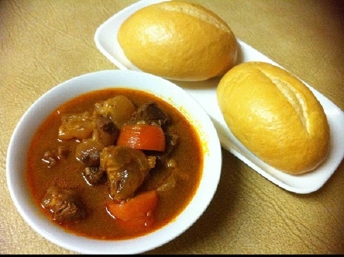 Từng miếng thịt mềm nhừ nhưng không nát, nước sốt màu hổ phách sóng sánh hấp dẫn được ăn kèm với bánh mì con cóc to hơn nắm tay một chút.