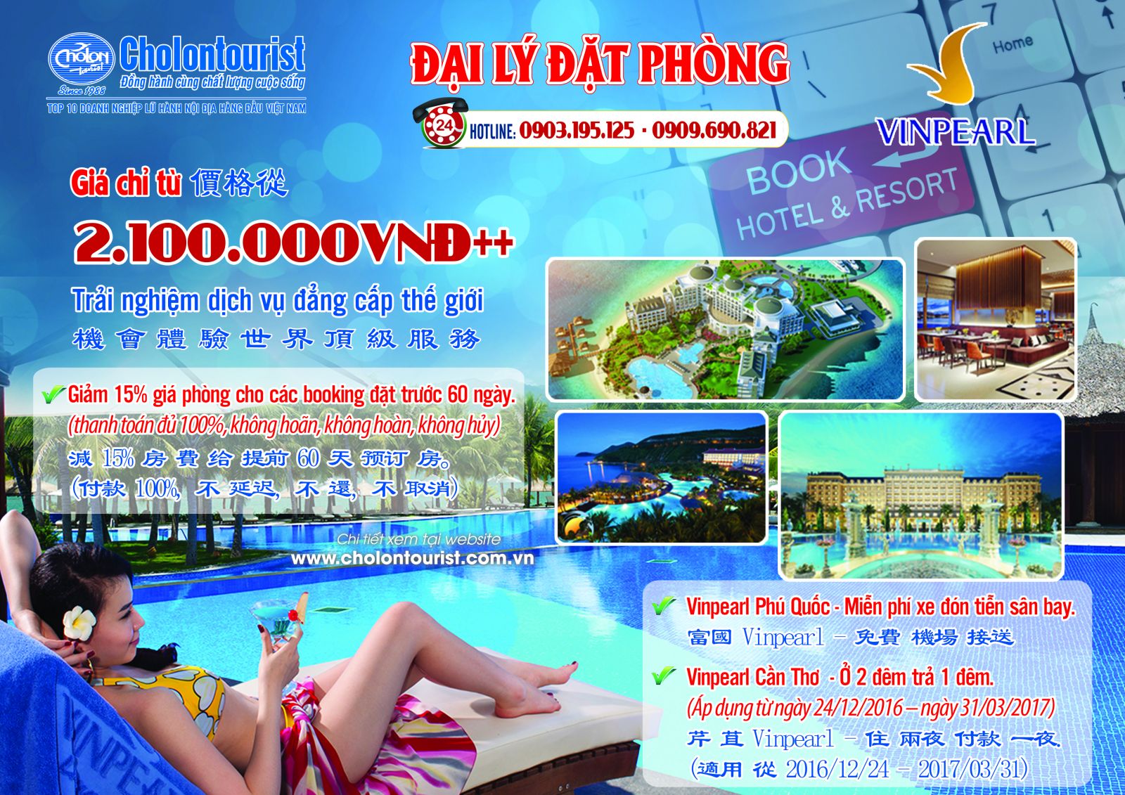 Cholontourist vinh dự là một trong những đại lý chính thức của Vinpearl. Từ ngày 01/01/2017 Quý khách hàng đăng ký phòng tại tất cả các khu nghỉ dưỡng Vinpearl qua Cholontourist sẽ nhận được các ưu đãi sau: